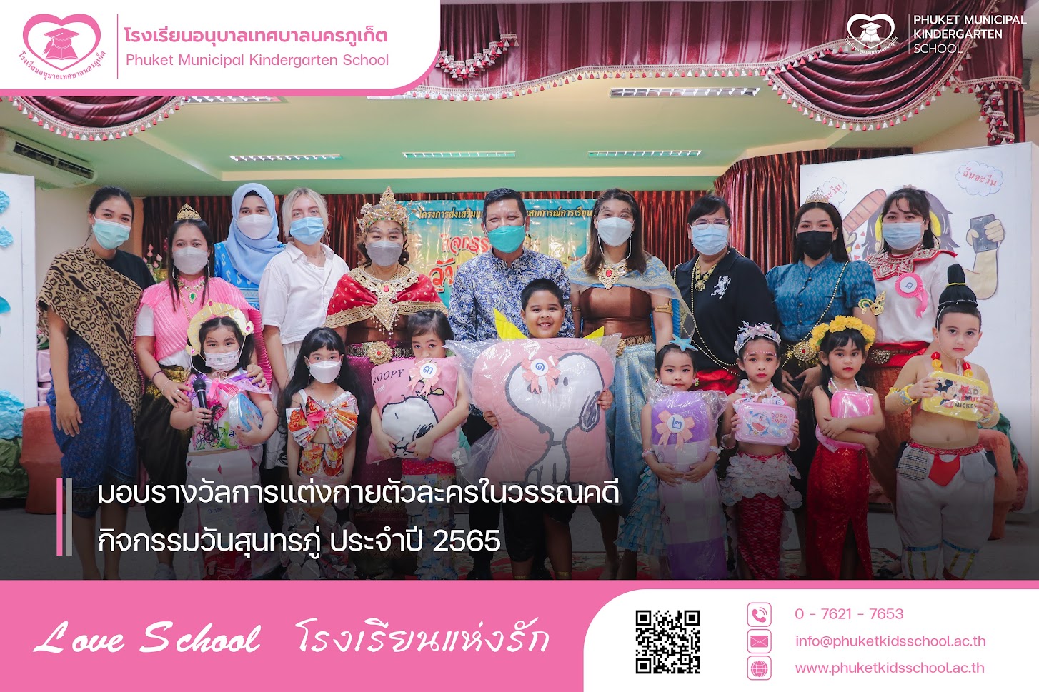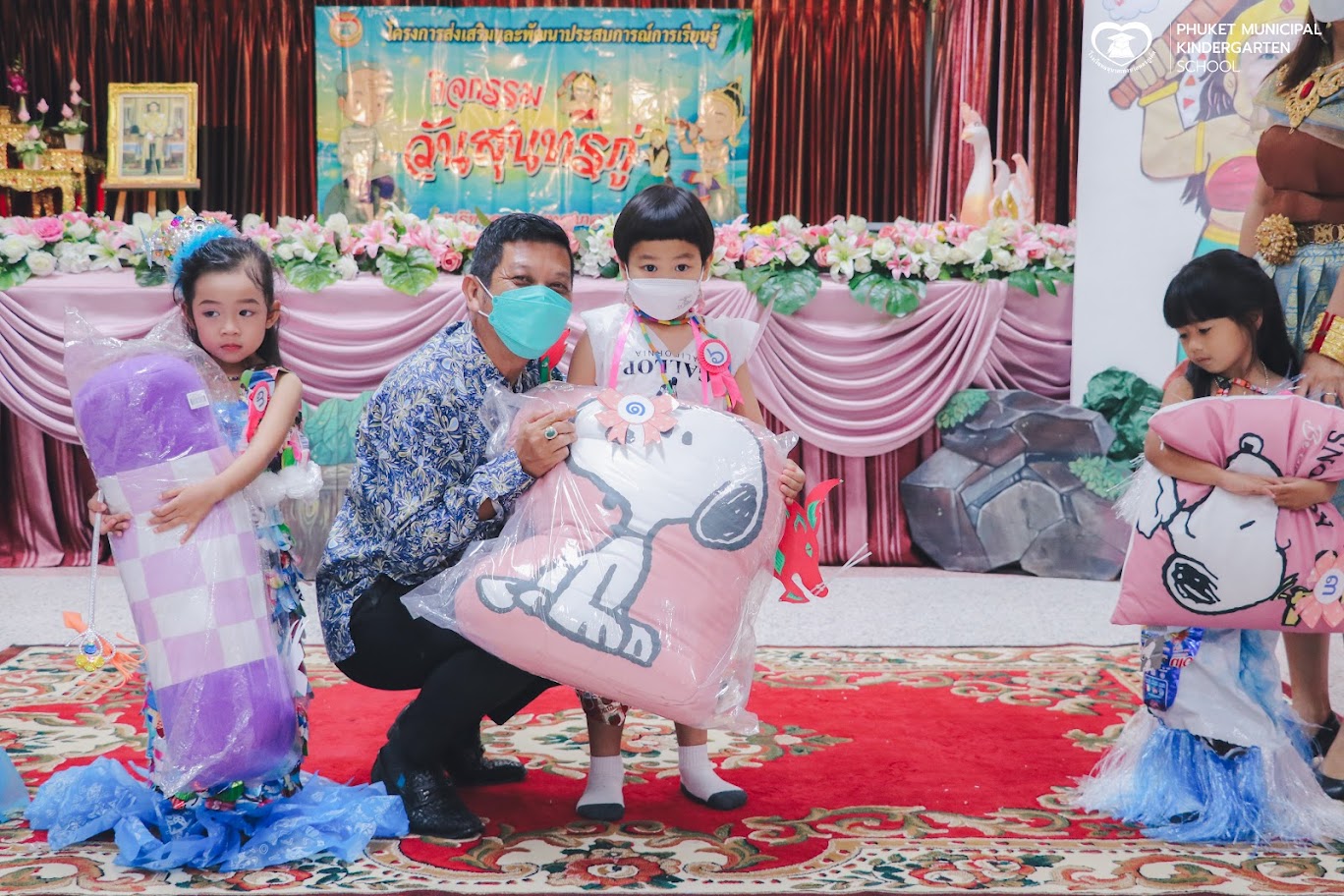 วันที่ 24 มิถุนายน 2565 นายพิศาล หัตการ รองนายกเทศมนตรีนครภูเก็ต พร้อมด้วยนางภัททิรา สุวรรณรัฐภูมิ ผู้อำนวยการสถานศึกษา พร้อมด้วยนางสาวปาล์มวรรณ อินจันทร์ รองผู้อำนวยการสถานศึกษา โรงเรียนอนุบาลเทศบาลนครภูเก็ต ให้เกียรติมอบรางวัลการประกวดแต่งกายตัวละครในวรรณคดี กิจกรรมวันสุนทรภู่ ประจำปี 2565 โดยมีนักเรียนและครูได้รับรางวัลดังนี้ ระดับชั้นอนุบาลปีที่ 1 รางวัลชนะเลิศ เด็กชายดลวรัชญ์ ปิยสวัสดิ์ธาดา ชั้นอนุบาลปีที่ 1/6 รางวัลรองชนะเลิศอันดับที่ 1 เด็กหญิงปิยาภรณ์ เทพพิชัย ชั้นอนุบาลปีที่ 1/3 รางวัลรองชนะเลิศอันดับที่ 2 เด็กหญิงปัณนภัทรส์ ผลาญไกรเพชร ชั้นอนุบาลปีที่ 1/5 ระดับชั้นอนุบาลปีที่ 2 รางวัลชนะเลิศ เด็กหญิงนภาพร วทัญญูกุล ชั้นอนุบาลปีที่ 2/2 รางวัลรองชนะเลิศอันดับที่ 1 เด็กหญิงณัฏฐ์รสา เกี่ยวข้อง ชั้นอนุบาลปีที่ 2/7 รางวัลรองชนะเลิศอันดับที่ 2 เด็กหญิงกันต์ธนวรรณ หลีเหล็ก ชั้นอนุบาลปีที่ 2/1 ระดับชั้นอนุบาลปีที่ 3 รางวัลชนะเลิศ เด็กชายจตุรภัทร จันทรัตน์ ชั้นอนุบาลปีที่ 3/8 รางวัลรองชนะเลิศอันดับที่ 1 เด็กหญิงณัฐยา ตันติสัมมารักษ์ ชั้นอนุบาลปีที่ 3/6 รางวัลรองชนะเลิศอันดับที่ 2 เด็กหญิงกานต์ธิดา ปิยะธรรม ชั้นอนุบาลปีที่ 3/1 ครูและบุคลากร ประเภทการแต่งกายผีเสื้อสมุทร : คุณครูจุรี ไสยรินทร์ ประเภทการแต่งกายนางเงือก : คุณครูปฐมา หวานดี ประเภทการแต่งกายสินสมุทร/สุดสาคร : คุณครูจินต์จุฑา กะนีจิตร ภาพเพิ่มเติม Categories: กิจกรรมนักเรียน