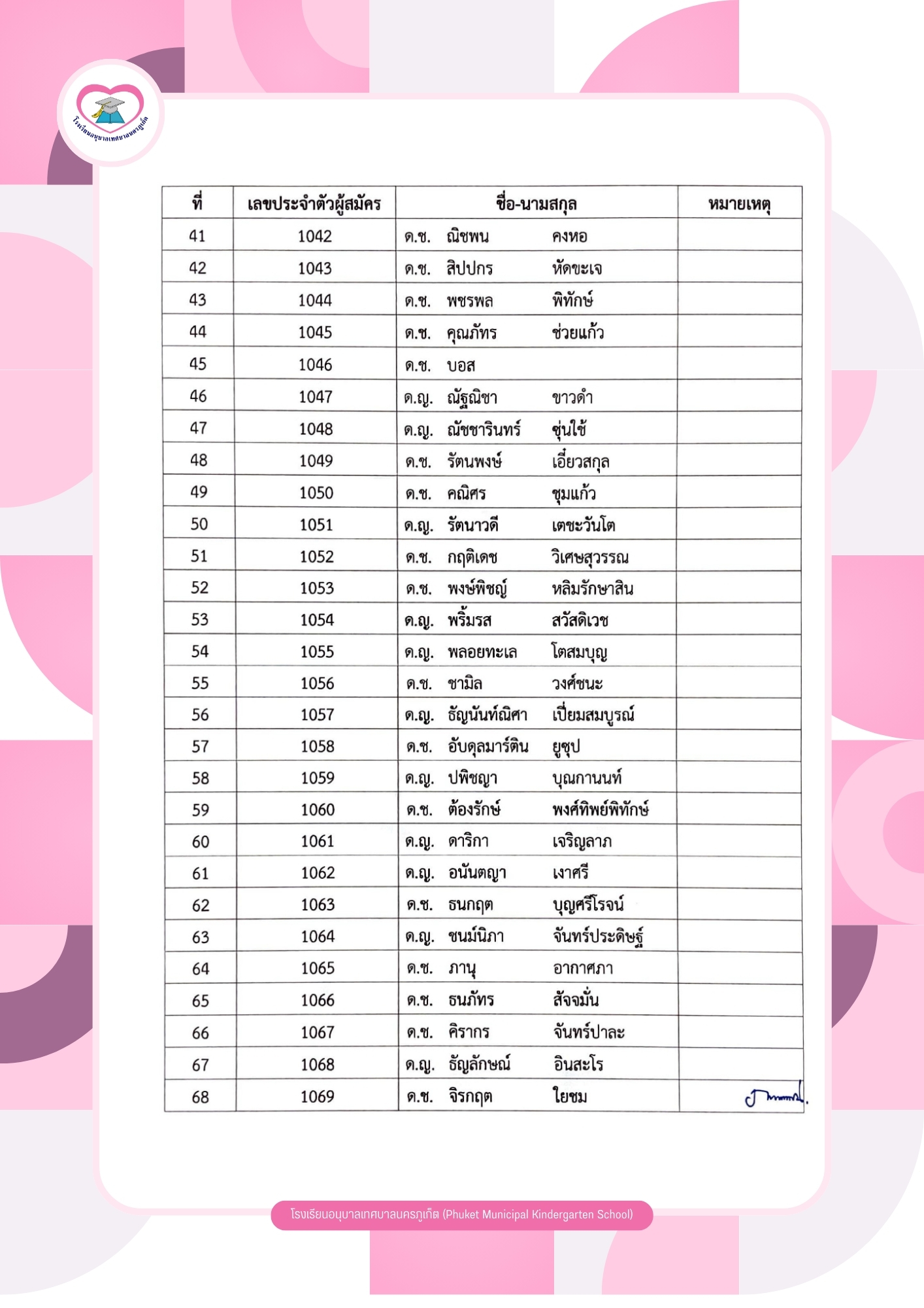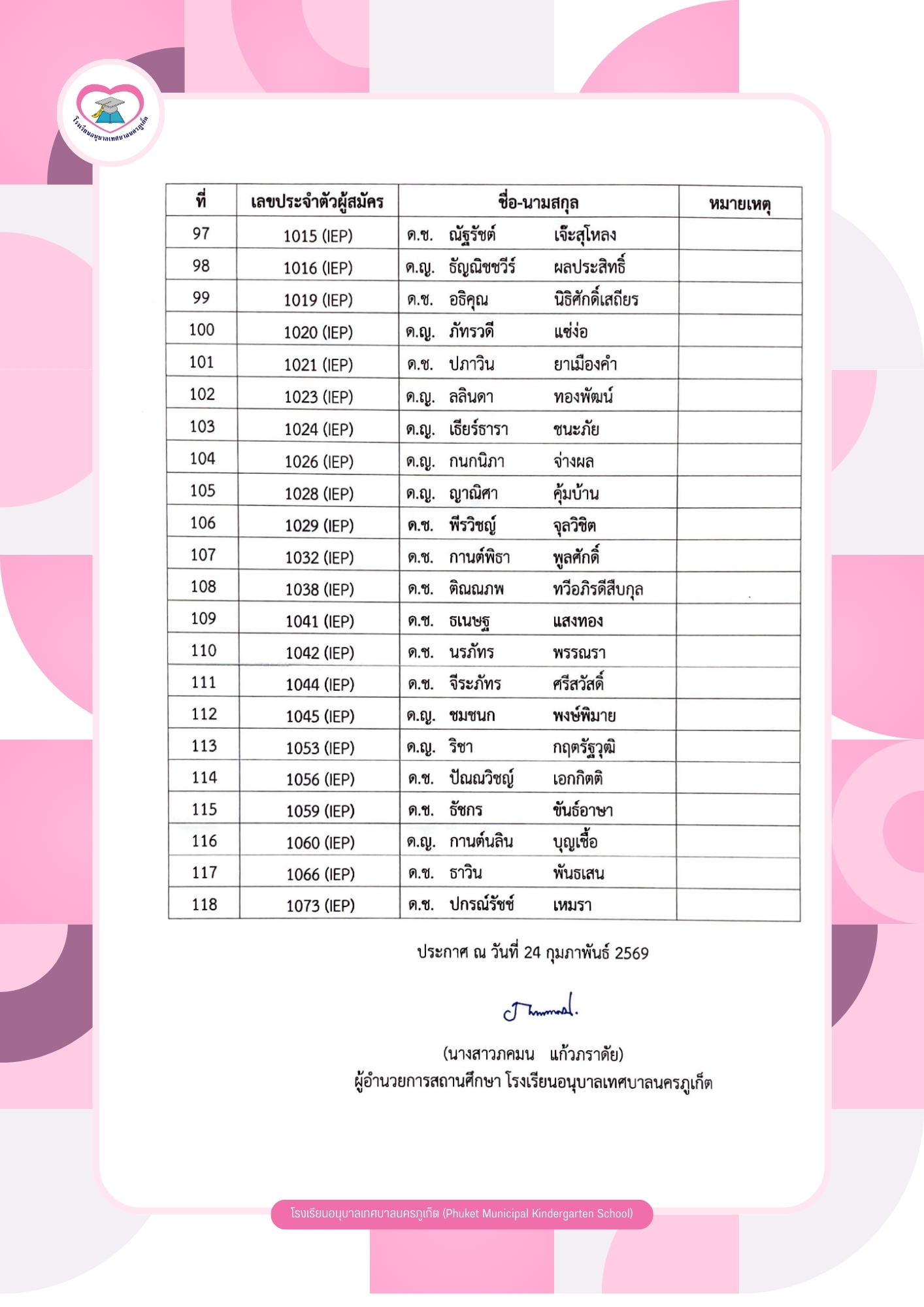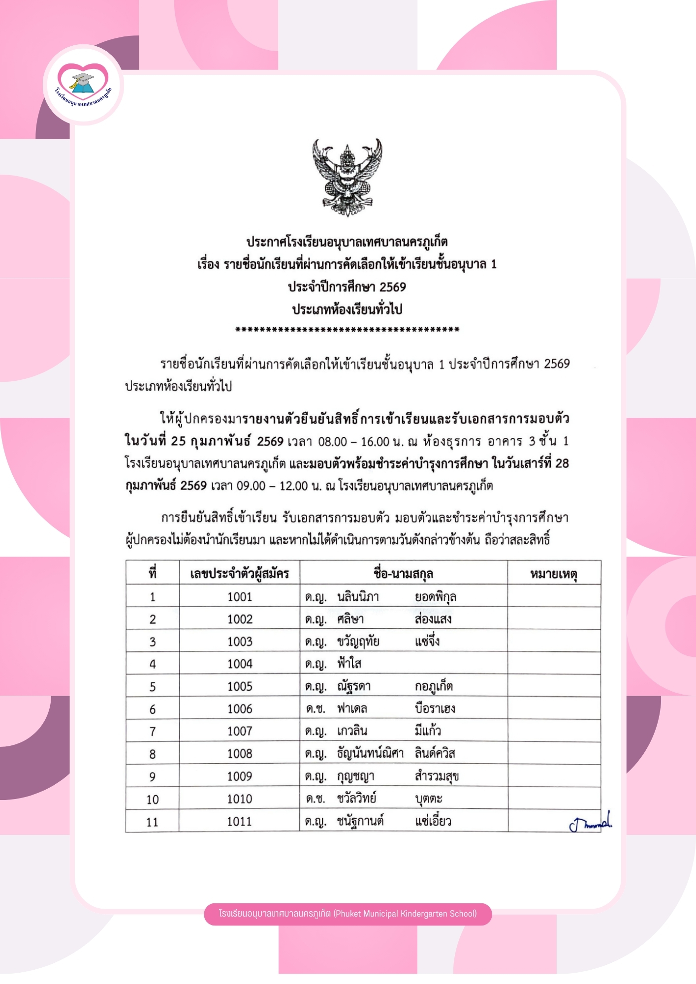รายชื่อนักเรียนที่ผ่านการคัดเลือกให้เข้าเรียนชั้นอนุบาลปีที่ 1 ประจำปีการศึกษา 2569 ประเภทห้องเรียนทั่วไป